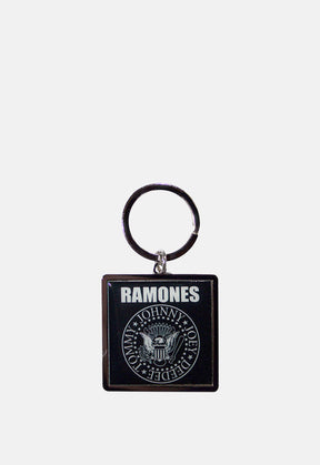 Metal keyring with attached band merch emblem.