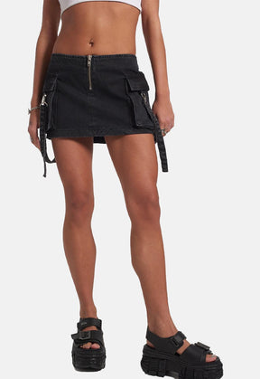 Denim mini skirt with cargo pockets and harness detail.